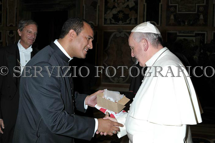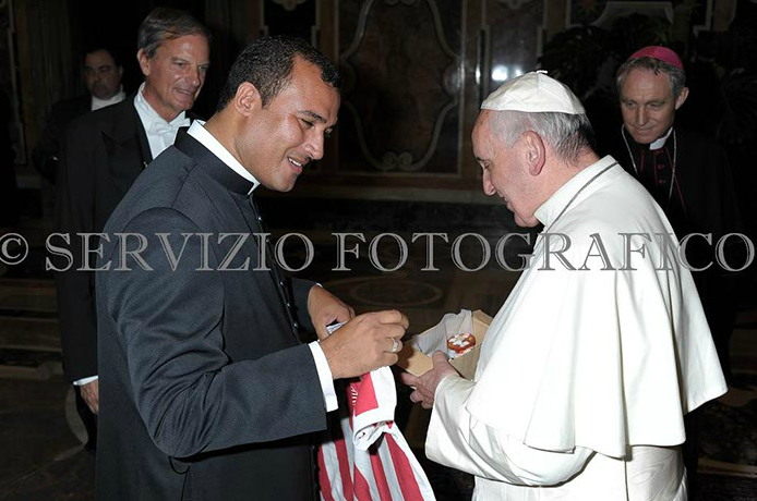 Não entendo presenteou o papa , mas o papa nem tocou na camisa ! Pois se tocou porque não tem a foto ?