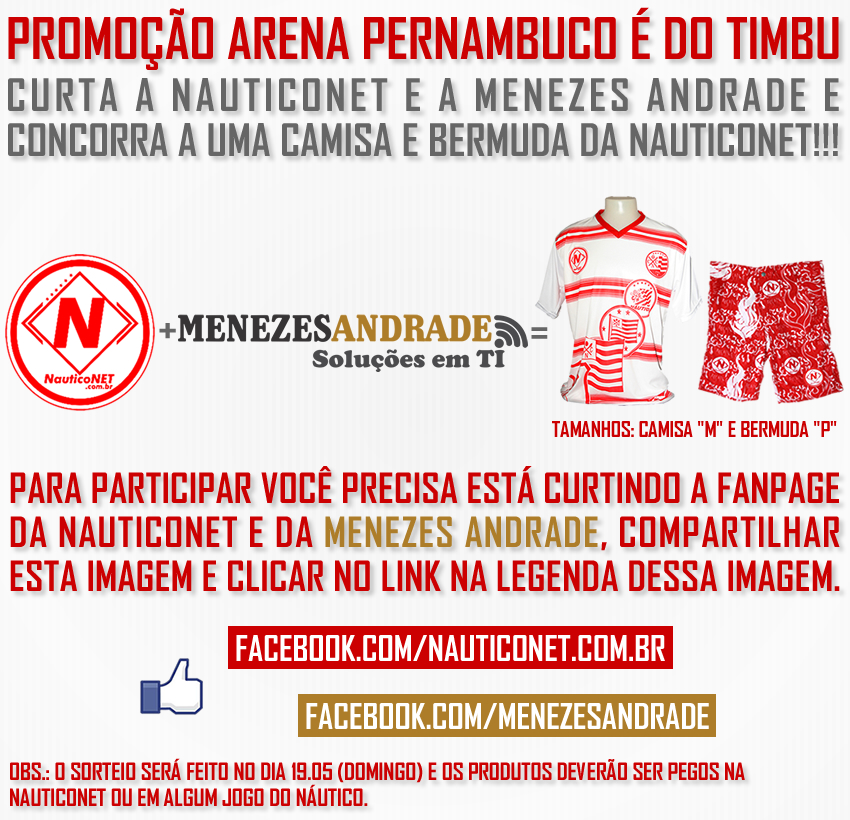 Para participar é muito simples, basta curtir as duas páginas http://www.facebook.com/NauticoNET.com.br/ e http://www.facebook.com/MenezesAndrade/ , curtir a imagem da promoção e compartilhar em modo público.