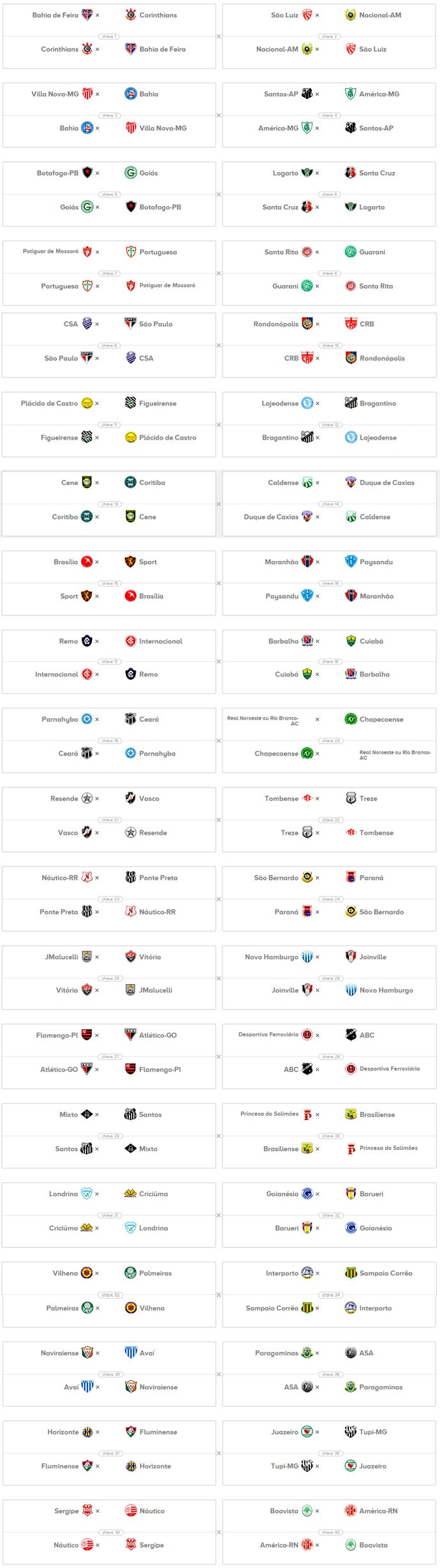 Primeiro grande clube a ter o duelo sorteado, o Fluminense estreia na competição contra o Horizonte-CE. O Internacional enfrenta o Remo-PA. O Santos pega o Mixto-MT; o São Paulo, o CSA-AL; e o Palmeiras, o Vilhena-RO. O Corinthians encara o Bahia de Feira de Santana, enquanto o Vasco faz um duelo regional com o Resende. O Coritiba enfrenta o Cene-MS; o Goiás, o Botafogo-PB; o Vitória, o J. Malucelli-SC; e o Bahia, o Villa Nova-MG. O Sport pega o Brasília; e o Náutico, o Sergipe. A Portuguesa pega o Portiguar-RN; e o Criciúma, o Londrina.
