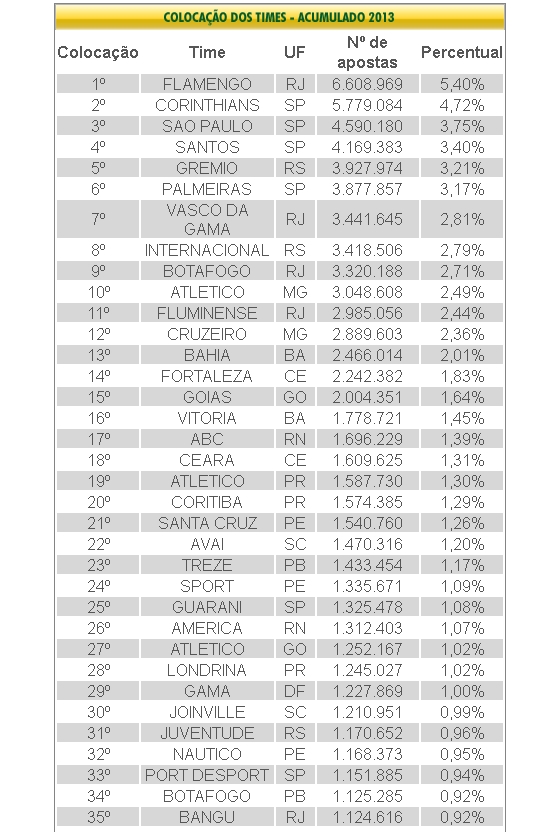 Entre os vinte primeiros lugares de 2013 estão clubes como Fortaleza, Goiás e ABC. O time nordestino com mais apostas foi o Bahia, 13º colocado, com 2,4 milhões. Ainda assim, o tricolor de Salvador teve 139 mil apostas a menos.