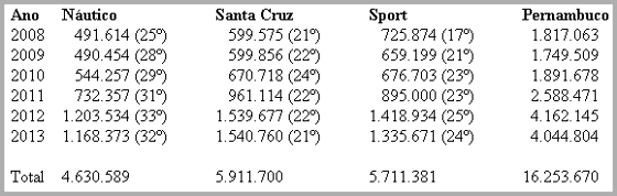 Encerrada a sexta temporada da Timemania, os clubes pernambucanos cadastrados na loteria federal registraram mais de quatro milhões de apostas. Pela segunda vez, os três maiores times do estado ultrapassam a barreira de um milhão de apostas cada um. No entanto, houve uma redução de 2,81% em relação aos dados ao ano passado.